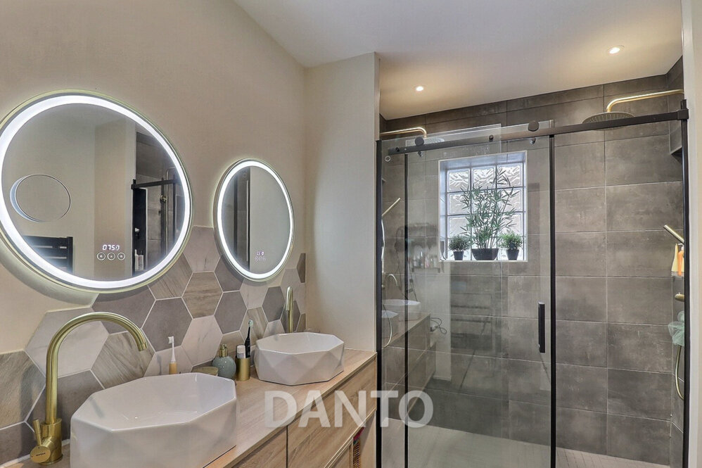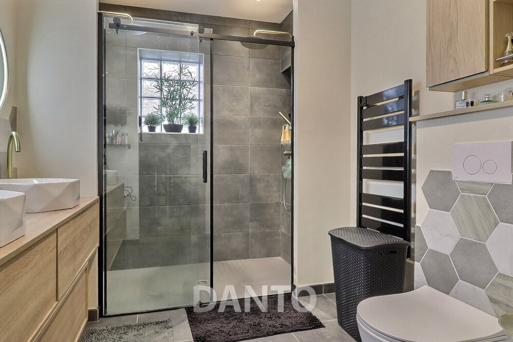Au rez-de-chaussée, la suite parentale constitue un véritable cocon d’intimité. Elle comprend un dressing, une grande salle d’eau avec double vasque, une douche à double pommeaux pour un confort optimal, ainsi qu’un WC suspendu.